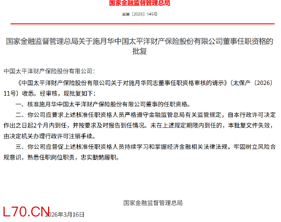 3月20日金融一线消息,国家金融监督管理总局近日发布批复,核准施月华中国太平洋财产保险股份有限公司董事的任职资格。