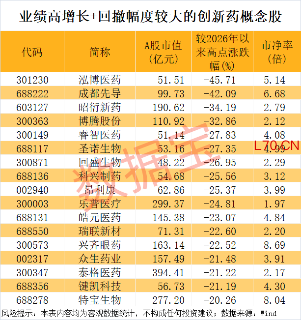 从二级市场表现来看,截至3月27日收盘,上述46只业绩高增长的创新药概念股中,最新收盘价较年内高点回撤20%以上的有17只。