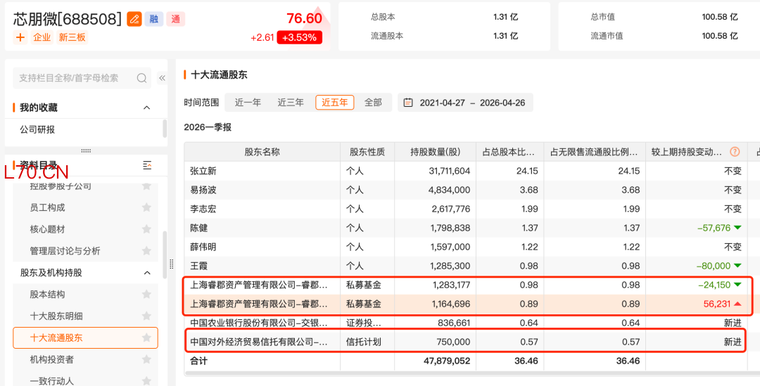 芯朋微一季报也显示,睿郡资产管理的睿郡有孚1号私募证券投资基金、睿郡有孚3号私募证券投资基金和外贸信托-睿郡稳享私募证券投资基金同时现身该公司前十大流通股东名单,其中外贸信托-睿郡稳享私募证券投资基金为一季度新进股东,三者合计持股数量为319.8万股。