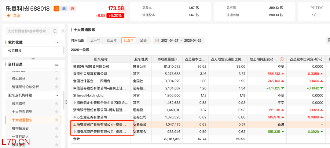 乐鑫科技近日发布的一季报显示,截至一季度末,睿郡资产旗下睿郡有孚1号私募证券投资基金和睿郡有孚3号私募证券投资基金位列该公司前十大流通股东名单,相较于2025年末,前者小幅减持15.5万股,但是后者新进该公司前十大流通股东,合计持股数量为203.64万股。