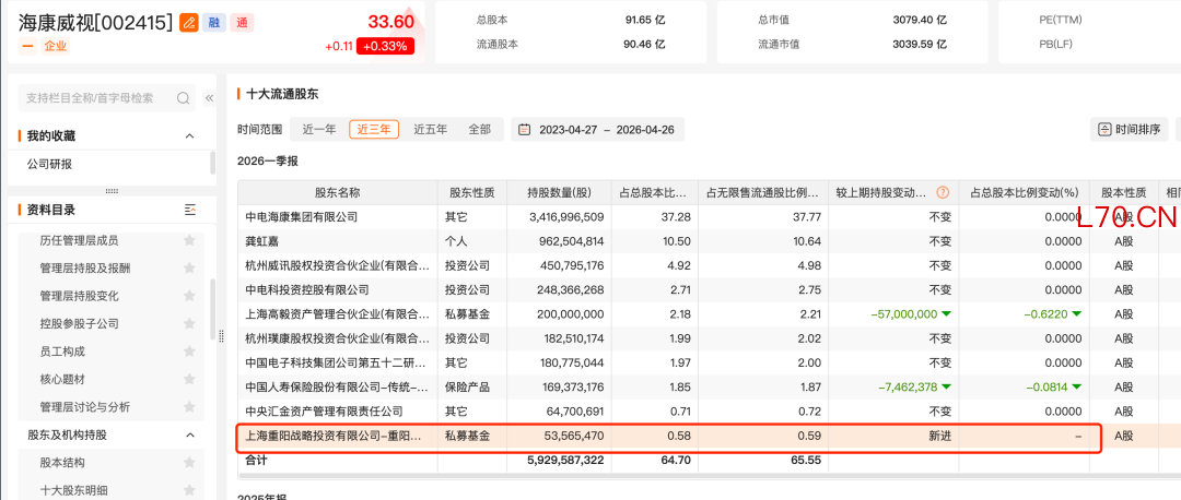 海康威视近日发布的一季报显示,截至一季度末,重阳战略才智基金新进该公司前十大流通股东名单,期末持股数量为5356.5万股,与持有海康威视多年的高毅邻山1号远望基金“同框”。