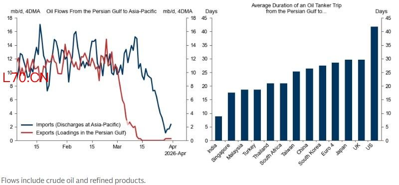 第一阶段是中东石油出口中断,这在冲突爆发初期便已发生。第二阶段是关键市场进口量萎缩——随着2月下旬从中东驶出的油轮陆续抵达目的地,这一阶段在3月下半月开始显现。