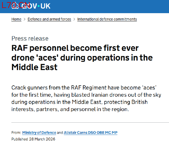 英国国防部表示,英国皇家空军兵团的精锐炮手首次荣获“王牌”称号。他们在中东行动中击落伊朗无人机,保护了英国在该地区的利益、伙伴及人员安全。