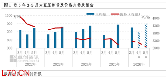 受巴西装船延期以及海关检疫政策的双重影响,叠加部分企业原料采购存在一定缺口,3月下旬起国内各区域生产企业均有不同程度的停机计划。根据卓创资讯数据统计显示,2026年3月大豆压榨量为804.46万吨,同环比均呈现增加态势,并高于过去4年同期均价水平。根据生产企业开停机计划显示,4月停机集中在华北、山东及东北地区,月内呈现前低后高态势,预估压榨量环比有所下滑为700万吨,但高于过去4年同期水平。此外,截至3月27日当周,生产企业库存为64.66万吨,高于去年同期及五年同期均值水平。因此,在成品库存偏高背景下,虽然部分区域阶段性供应下滑,但市场整体供应表现宽松,难以对豆粕价格形成有效支撑。4月中下旬,伴随着巴西大豆陆续到港,油厂开机恢复,供应端压力释放,价格重心将进一步下移。