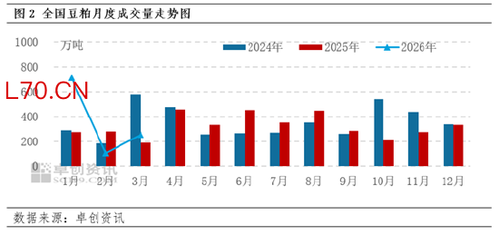 根据卓创资讯数据监测显示, 2-3月生产企业豆粕成交总量365.93万吨,低于往年同期水平。企业现货销售节奏普遍不快,以华东市场为例,4月份企业销售进度不足四成,部分企业库存压力较大,也侧面反馈出豆粕需求端的疲软态势。
